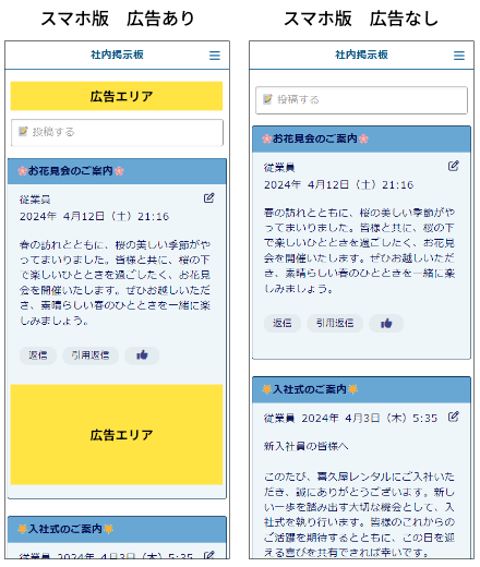 | 広告の非表示 | ●どの掲示板にアクセスしても広告が表示されません。 | ●管理中の掲示板の広告を非表示にできます。(複数契約可能) |